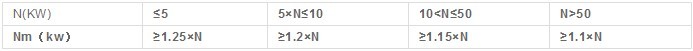 泵的選型確定后,根據(jù)樣本數(shù)據(jù)可查到三螺桿泵的軸功率 N ,該軸功率再加上一定的功率儲(chǔ)備后,作為選配電機(jī)的依據(jù),一般電機(jī)功率 Nm 應(yīng)不小于泵軸功率 N 乘以功率儲(chǔ)備系數(shù) K 后所得值,K 值可參照下表取值:
