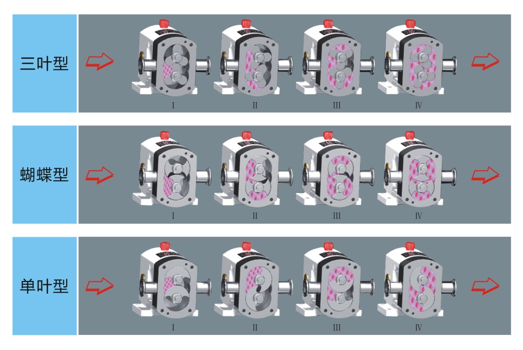 轉(zhuǎn)子泵又稱羅茨泵、膠體泵、高濃漿泵等,它依靠兩個(gè)同步運(yùn)動的轉(zhuǎn)子,由一對外置式同步齒輪箱進(jìn)行傳動,轉(zhuǎn)子在傳動軸的帶動下進(jìn)行同步反方向旋轉(zhuǎn),從而構(gòu)成了較高的真空度和排放壓力。兩轉(zhuǎn)子將轉(zhuǎn)子室分隔成幾個(gè)小空間,并按I-II-III-IV的次序運(yùn)轉(zhuǎn)。運(yùn)轉(zhuǎn)到I位置時(shí),只有進(jìn)口處充滿介質(zhì);運(yùn)轉(zhuǎn)到II位置時(shí),II室中封閉了部分介質(zhì);到位置時(shí),III室中也封閉了介質(zhì);到位置IV時(shí),進(jìn)口處和出口室相通,介質(zhì)即被輸送至出物料管道。按這樣的循環(huán)往復(fù),介質(zhì)即被不斷的輸送出去。